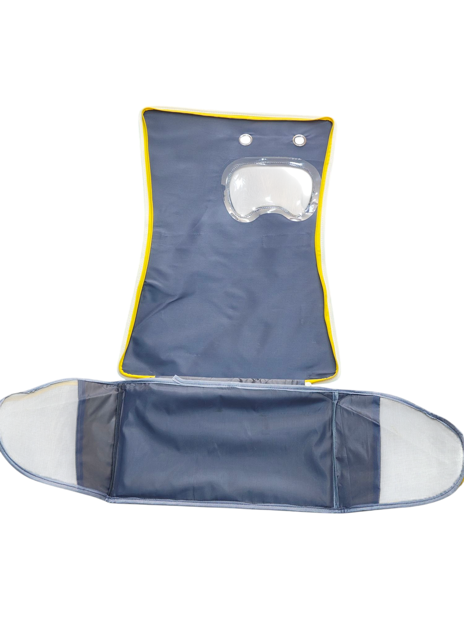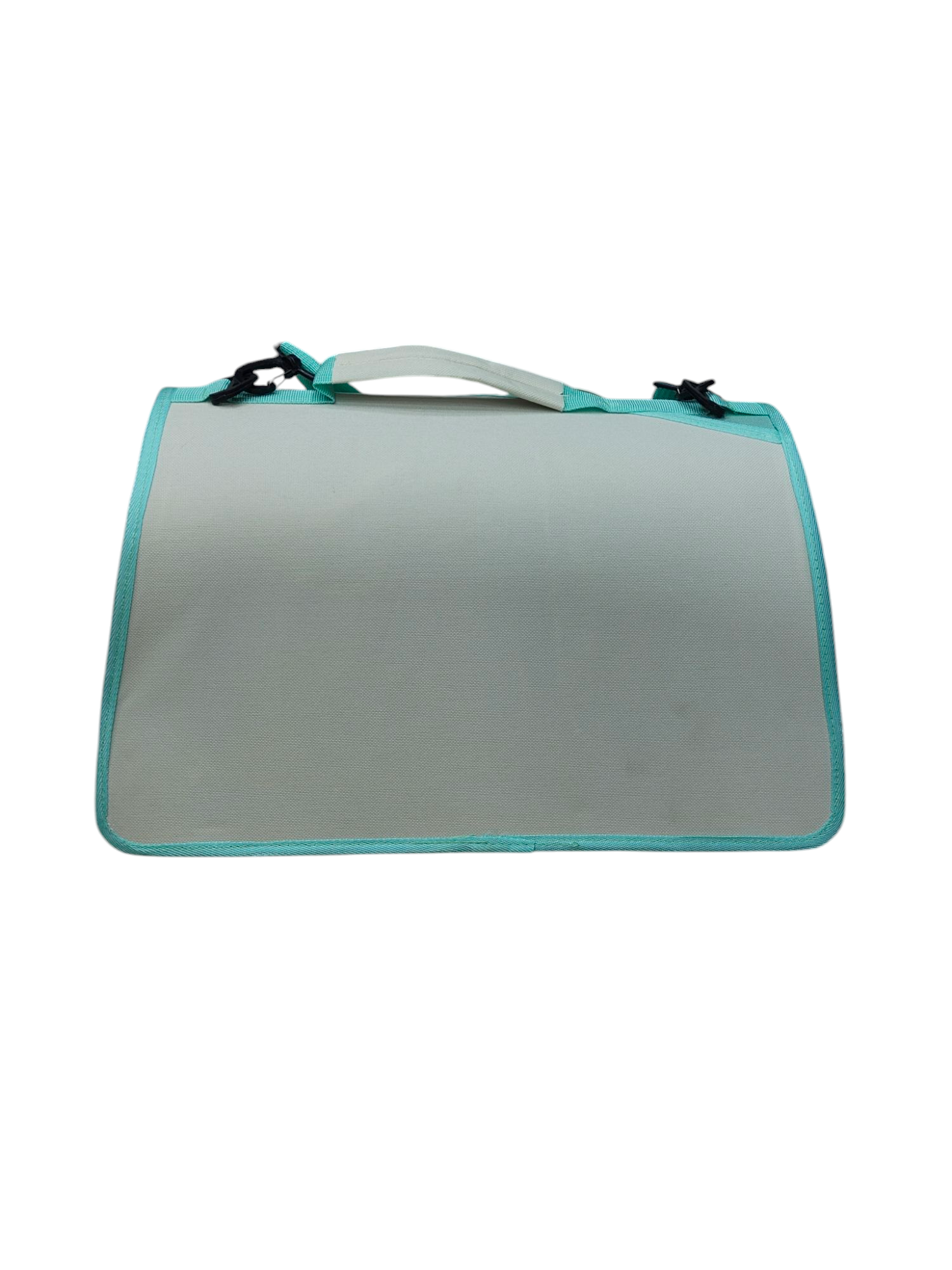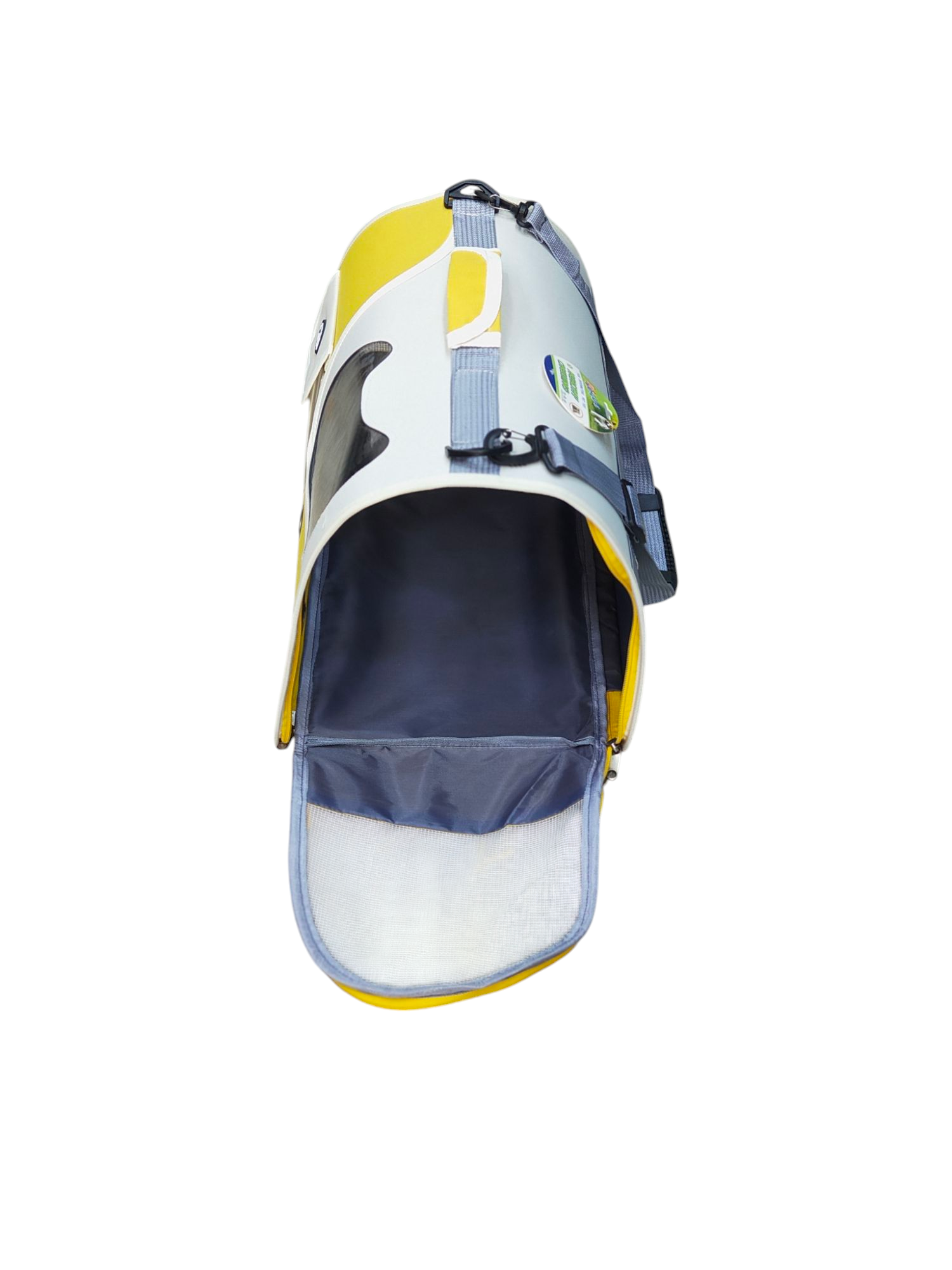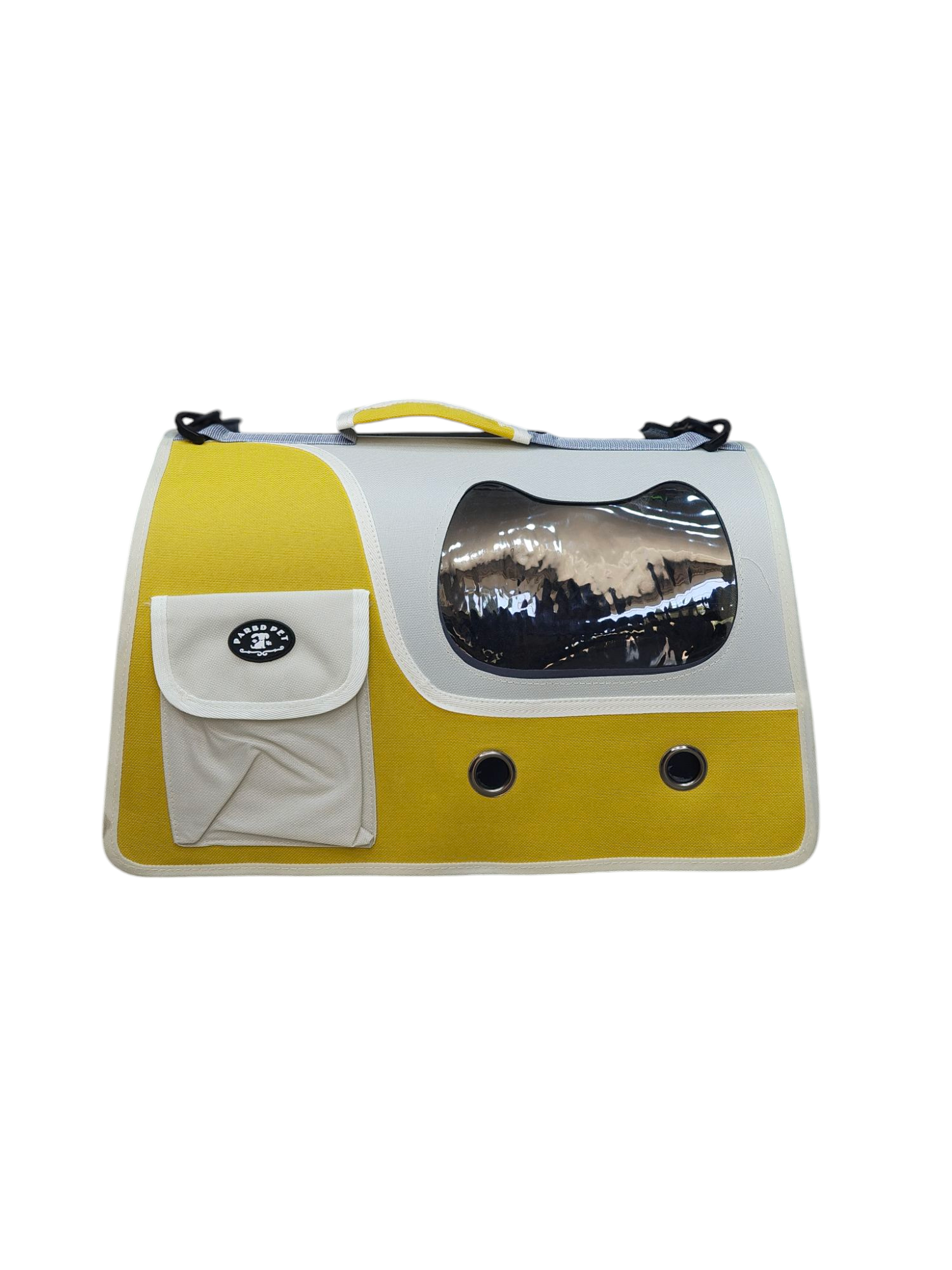 Crafted from durable canvas in vibrant color-blocked tones of yellow and white, the carrier also includes breathable mesh panels on the sides for excellent airflow. A secure zippered opening allows for easy access, while the side pocket provides space for treats, waste bags, or small essentials.