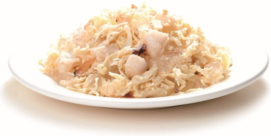 Chicken, scallops, starch, carrageenan, salt, bonito (fish), taurine, tea extract, Vitamins (A, B2, B3, B5, D3, E), calcium carbonate.