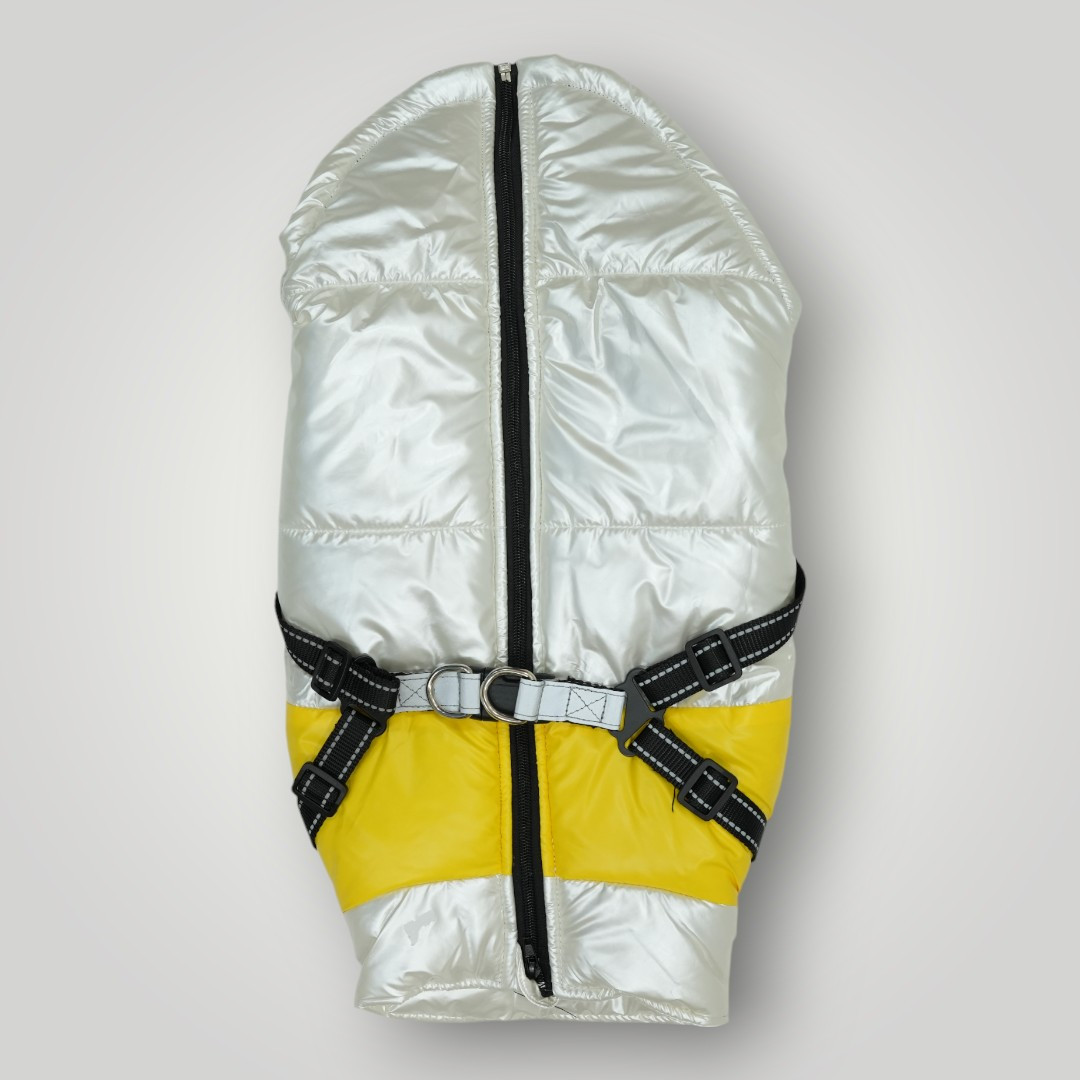Keep your furry companion cozy and stylish during winter walks. This waterproof jacket features a sleek, glossy silver body accented by a bold yellow stripe. The built-in harness with secure buckle straps offers both style and practicality—perfect for cold-weather outings.