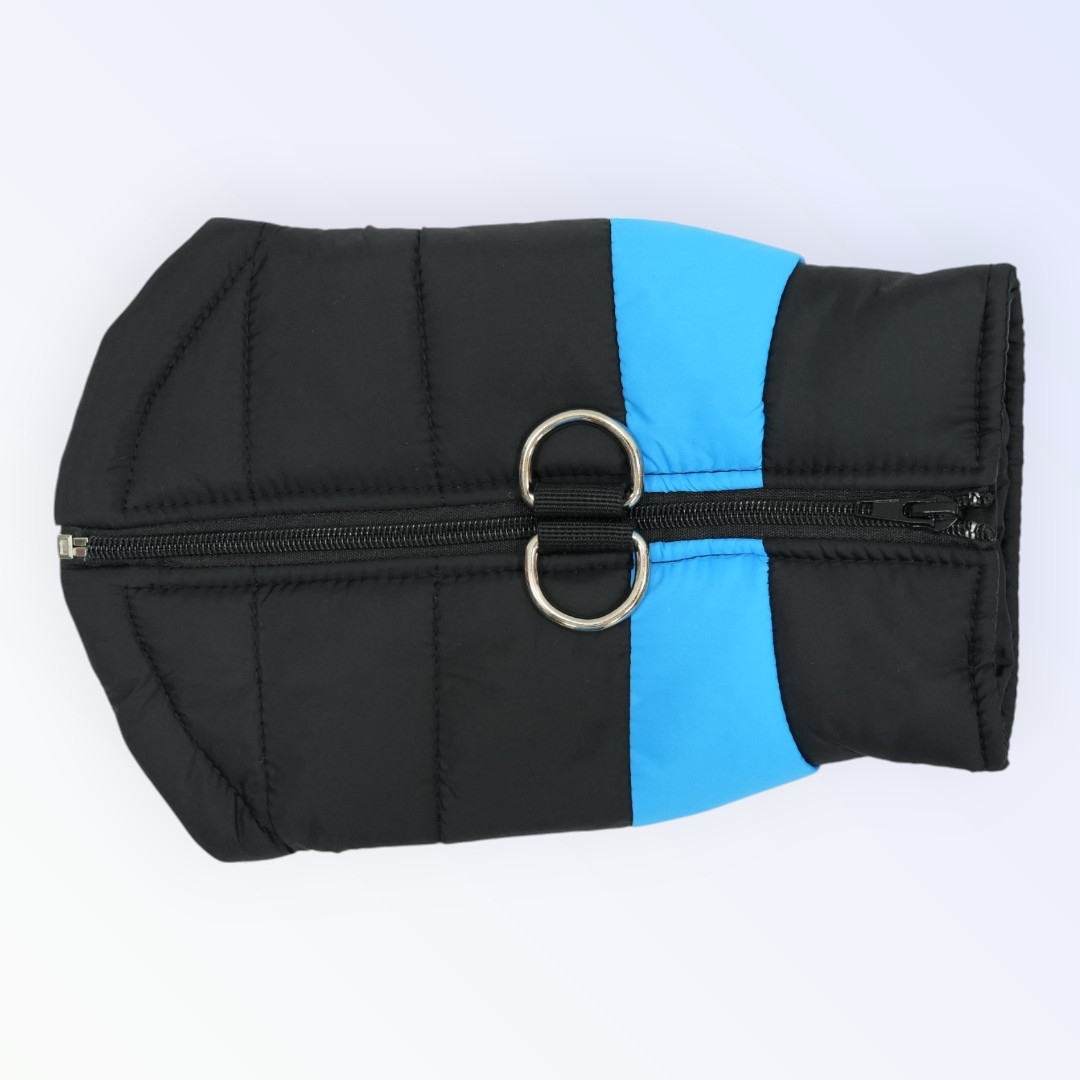 This fashionable waterproof winter jacket features a sleek black body accented by a bold blue chest stripe—designed to keep your pet warm while standing out in style. Ideal for both dogs and cats, this jacket blends winter functionality with everyday convenience, offering insulated comfort and secure control for outdoor adventures.