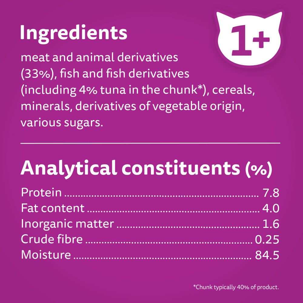 WHISKAS® 1+ tuna adult cat food pouches in jelly are specially prepared to preserve the natural goodness and deliciousness of high quality ingredients and will see your cat rush to the bowl faster than ever before! Made with sustainably sourced ingredients, these cat food pouches contain everything your cat needs to keep them happy and healthy.