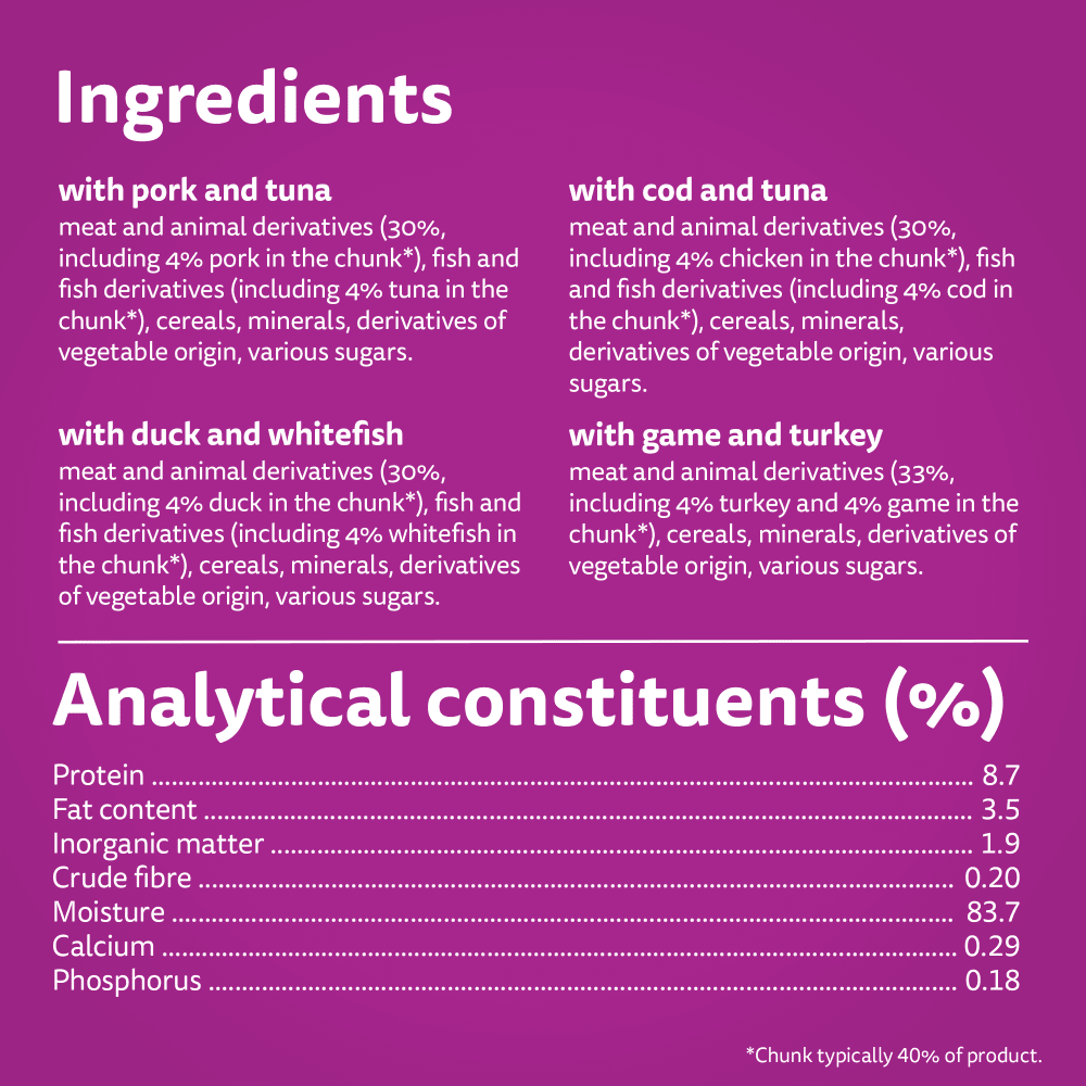 - With Pork & Tuna – Meat and animal derivatives (30%, including 4% pork in the chunk), fish and fish derivatives (including 4% tuna in the chunk), cereals, minerals, derivatives of vegetable origin, and various sugars.