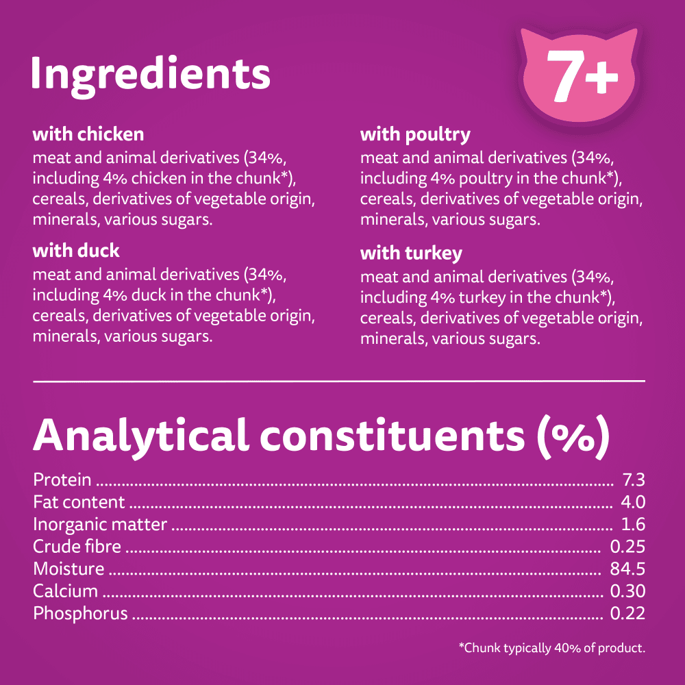 Whiskas® 7+ Poultry Feasts senior cat food pouches in gravy are expertly crafted to preserve the natural goodness and delicious taste of high-quality ingredients. Designed for senior cats aged 7+ years, these meals provide all the essential nutrients to support aging cats while ensuring a satisfying and enjoyable mealtime experience.