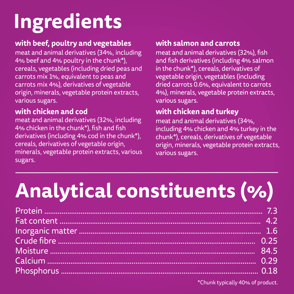 - With Beef, Poultry & Vegetables – Meat and animal derivatives (34%, including 4% beef and 4% poultry in the chunk), cereals, vegetables (including dried peas and carrots mix 1%, equivalent to 4% fresh peas and carrots mix), derivatives of vegetable origin, minerals, vegetable protein extracts, and various sugars.