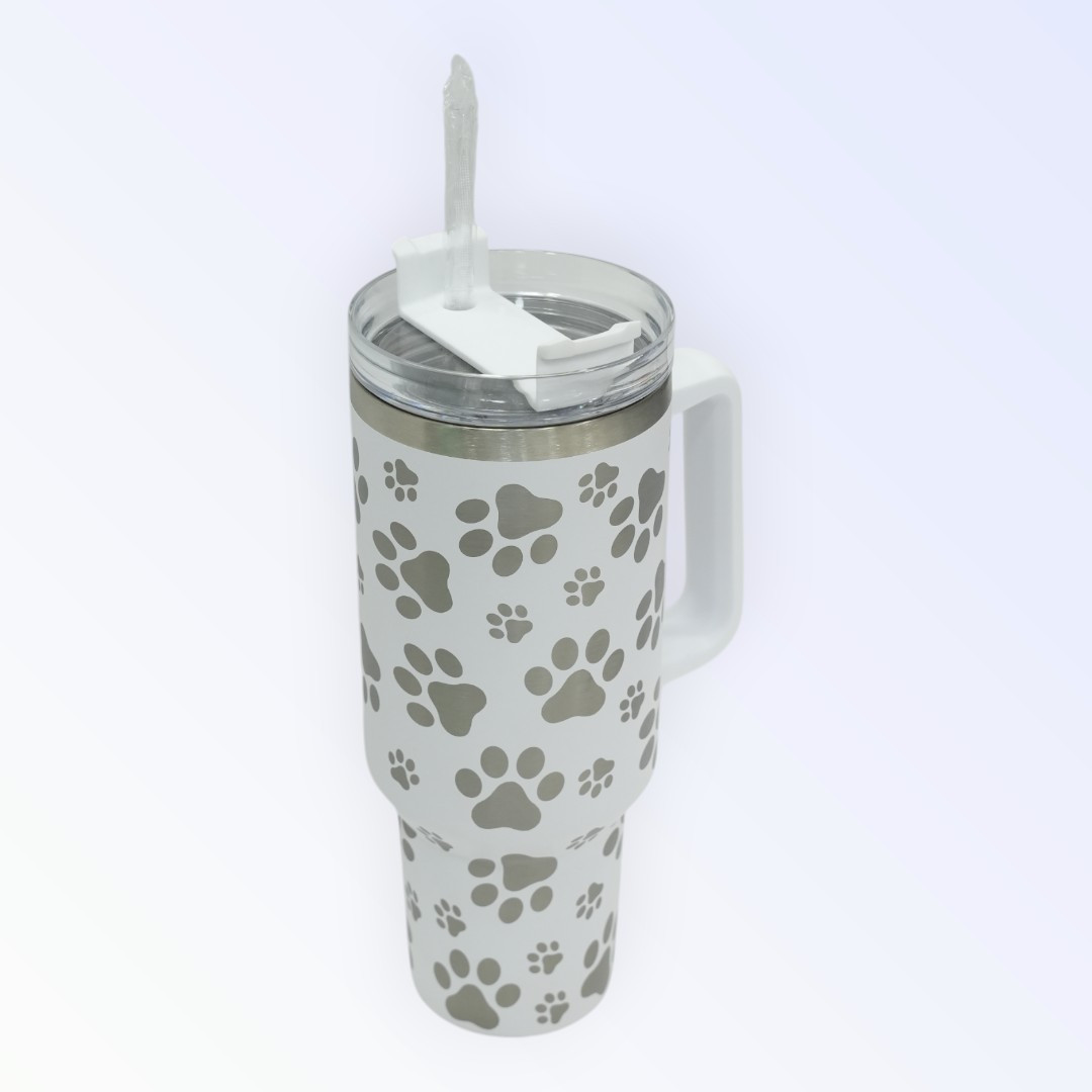 This elegant white tumbler with silver paw prints is the perfect blend of charm and functionality for pet lovers. With its clean design and subtle shimmer, it makes a stylish companion whether you're at home, at work, or on the go.