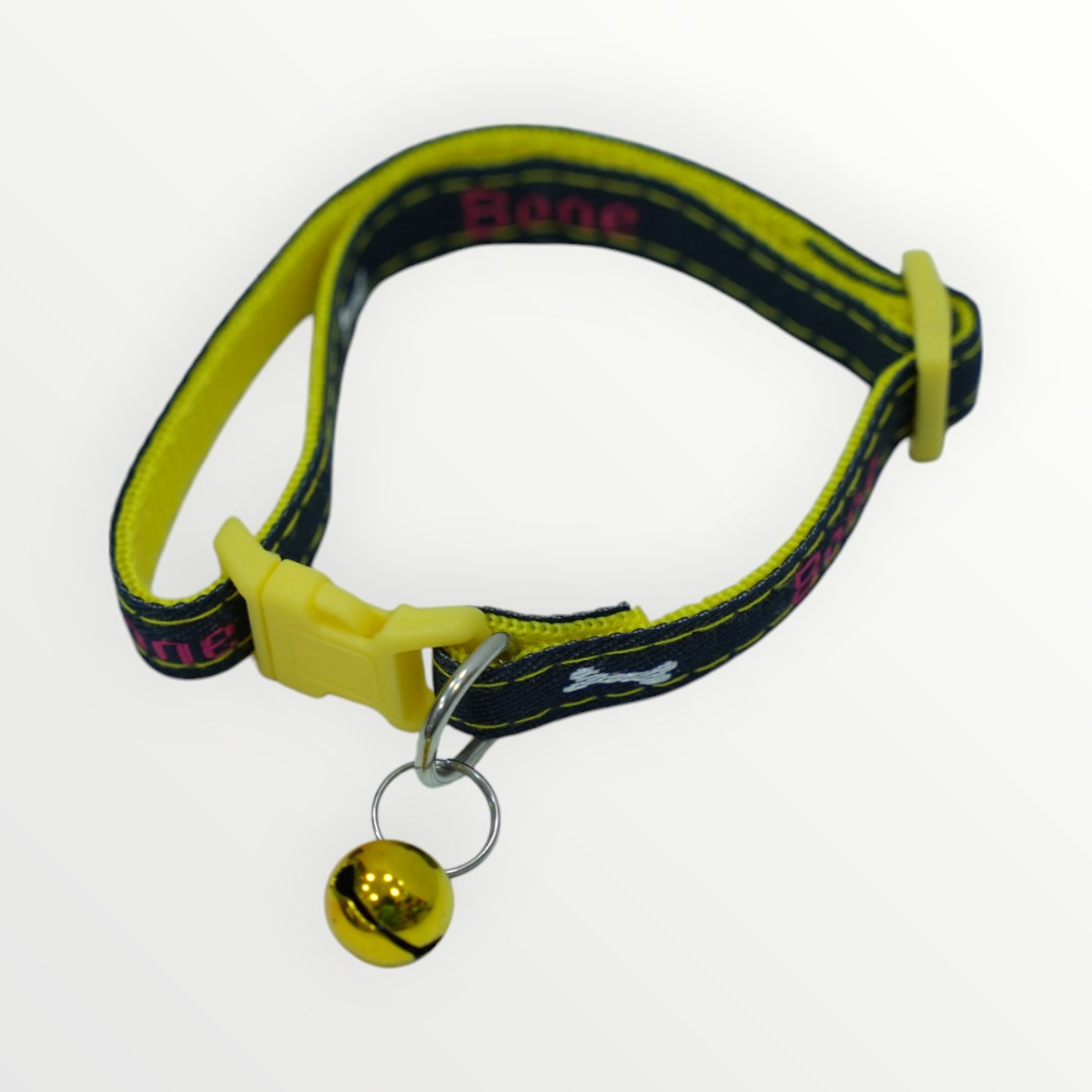 Add flair and function to your feline's accessories with this vibrant yellow and black collar. Featuring a cheerful yellow bell and playful bone detailing, it’s both stylish and practical. The adjustable strap ensures a snug fit, and the durable, lightweight material offers all-day comfort for curious kitties.