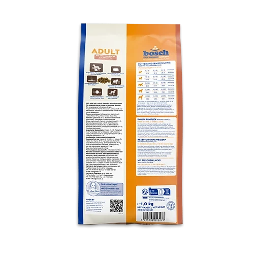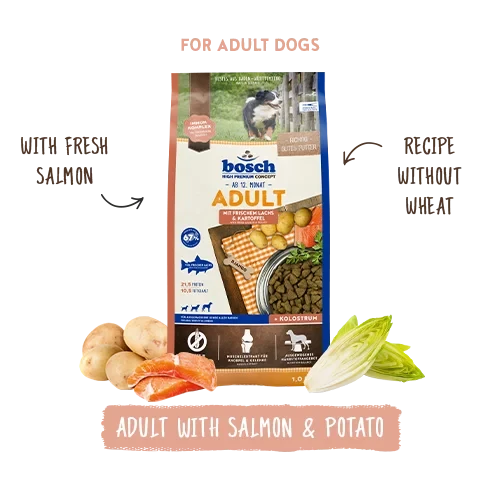 Bosch HPC Adult with Salmon & Potato is a complete and balanced dry food for adult dogs from 12 months of age with normal activity levels. This premium-quality food is crafted using fresh salmon (14%) as a high-quality protein source and essential fatty acids to promote healthy skin and a shiny coat. It is free from wheat and designed to meet the needs of nutritionally sensitive dogs. Enriched with mannans, glucans, and colostrum, this formula supports intestinal flora, strengthens the immune system, and ensures overall well-being. Mussel extracts provide joint and cartilage support, making it an excellent choice for maintaining mobility.