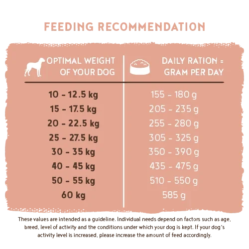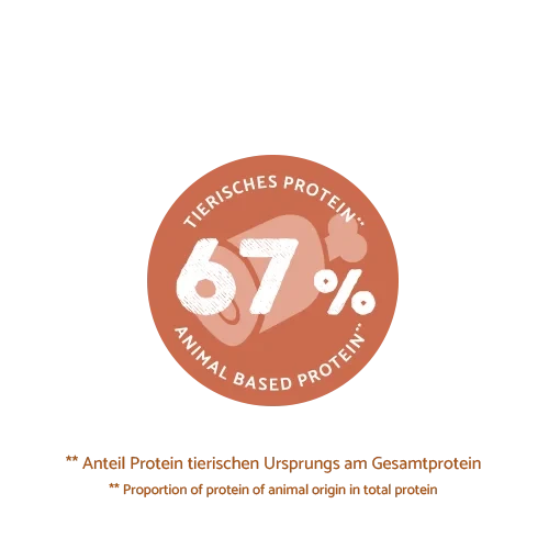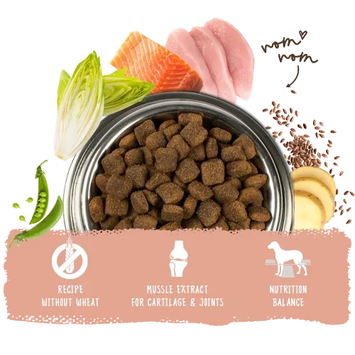 Poultry protein (dried), salmon (fresh, 14%), millet, barley, maize, rice, potatoes (dried, 5%), beet pulp (desugared), poultry fat, protein hydrolysate, peas (dried), fish oil, yeast (dried, 0.1% mannan-oligosaccharides, 0.06% beta-glucans), sodium chloride, colostrum (0.2%), monocalcium phosphate, potassium chloride, green-lipped mussels (dried, 0.1%), chicory (dried).