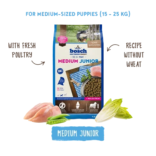Bosch HPC Medium Junior offers tailored nutrition for medium-sized puppies, supporting their growth and setting them on a path to a healthy adulthood!