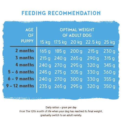 Feeding Recommendations: Refer to the feeding chart based on your puppy’s age and expected adult weight. Adjust as needed for activity levels and other factors. Always provide fresh water, and introduce food gradually over 3–5 days to avoid digestive issues.