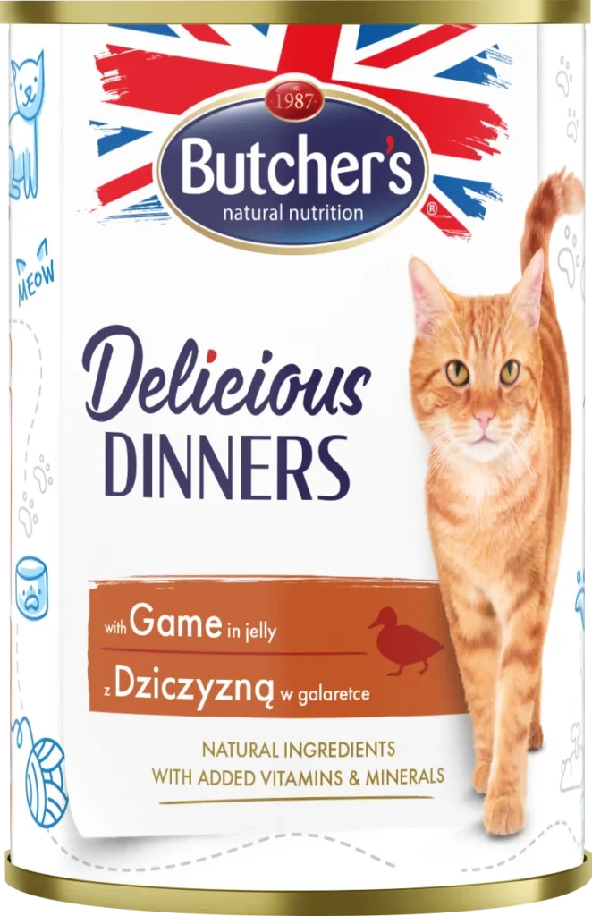 Satisfy your cat’s natural instincts with Butcher’s Delicious Dinners Chunks in Jelly with Game – a rich, complete meal featuring game meat, chicken, and liver in a savory jelly. Steam-cooked to preserve flavor and nutrients, this grain-free recipe is made with natural ingredients and enriched with essential vitamins and minerals for your cat’s well-being.