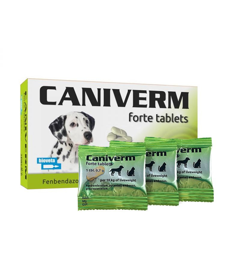 Caniverm Forte is a broad-spectrum deworming tablet used to combat roundworms and tapeworms in dogs, cats, and other members of the canine and feline families. The tablets are light yellow, each weighing 0.7 g.
