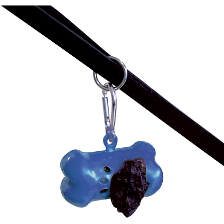 Insert a bag roll into the dispenser, thread the first bag through the opening, and pull as needed. Attach the dispenser to any leash using the carabiner.