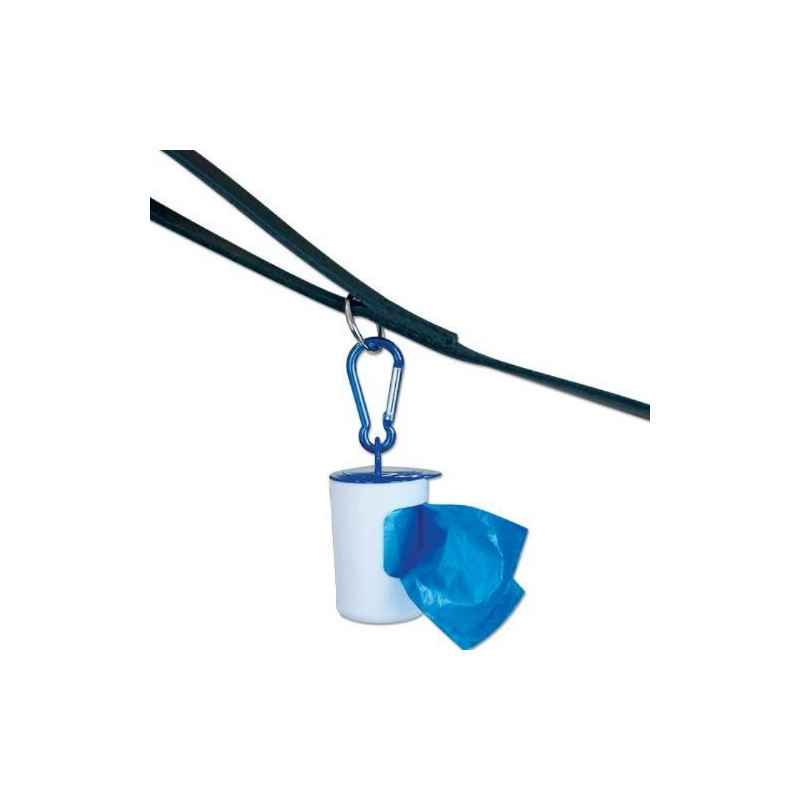 Insert a roll into the dispenser, thread the first bag through the opening, close the lid, and attach the dispenser using the carabiner clip.