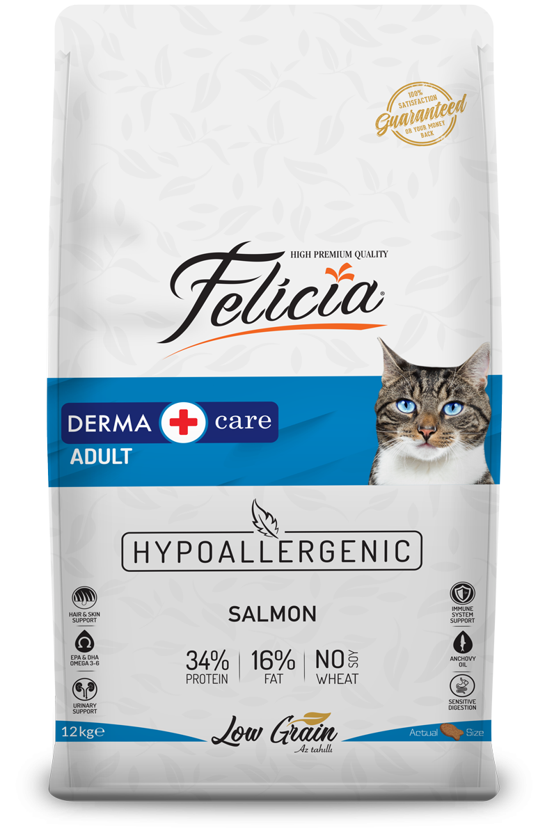 Felicia Derma Care is a premium hypoallergenic cat food specially designed for adult cats with sensitive skin or coat concerns. Featuring salmon as the primary protein source, this low-grain formula provides balanced nutrition to support healthy skin, a shiny coat, and overall well-being.