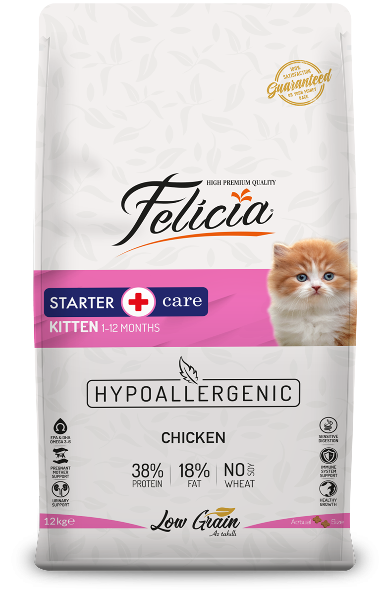 Felicia Starter Care Kitten Food with Chicken is specially designed with the highest quality natural ingredients to ensure the well-being and healthy development of your new family member. Trust Felicia® for a happy, healthy kitten.
