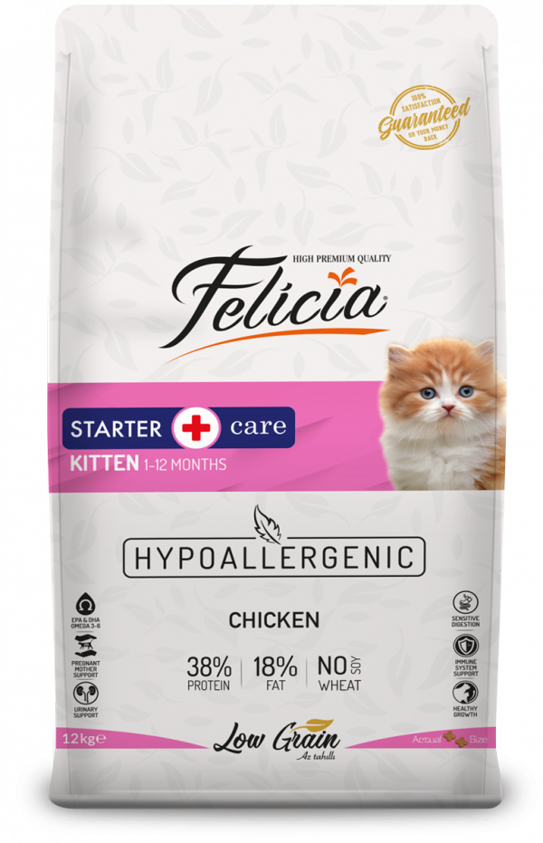 Felicia Starter Care Kitten Food with Chicken is specially designed with the highest quality natural ingredients to ensure the well-being and healthy development of your new family member. Trust Felicia® for a happy, healthy kitten.