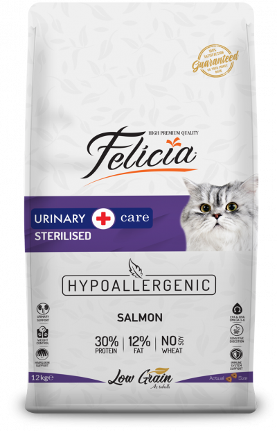 Felicia Urinary Care is a premium hypoallergenic cat food specially formulated for sterilized adult cats. With salmon as the primary protein source, this recipe supports urinary health, weight control, and overall well-being. Its low-grain formula ensures gentle digestion and provides balanced nutrition tailored to sterilized cats.