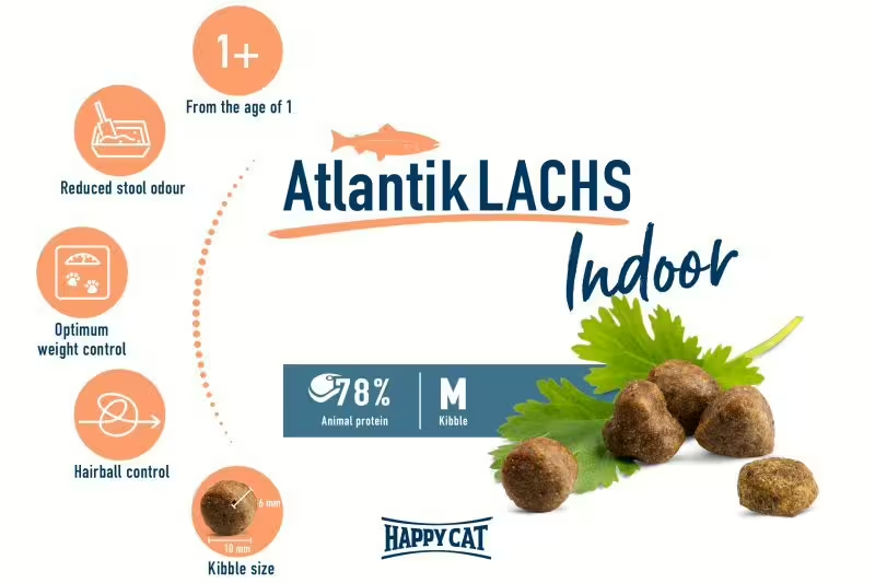- Active, playful indoor cats benefit from Happy Cat Indoor Atlantic Salmon due to its moderate fat content.