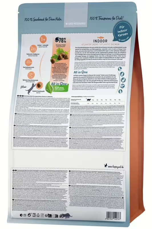 Happy Cat Indoor Adult Atlantic Salmon is a premium dry food tailored to meet the specific needs of indoor cats. This delicious recipe with salmon and herbs supports a healthy weight, reduces stool odour, and offers effective hairball control, making it ideal for long-haired indoor cats.