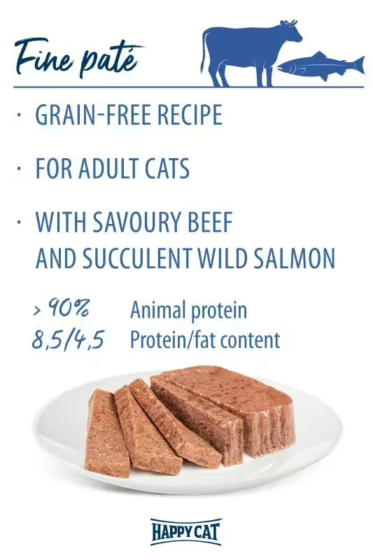 Happy Cat Minkas Duo Beef & Salmon is a delicious grain-free pâté, offering a flavorful and balanced meal for adult cats. This premium wet food combines hearty beef (9%) with succulent salmon (5%), providing high-quality protein and essential nutrients for overall well-being. With its soft pâté texture, it is easy to eat and digest, making it an ideal choice for even the most selective felines.