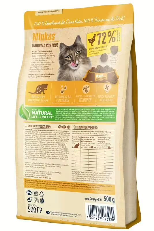 Happy Cat Minkas Hairball Control Poultry is specially formulated to help reduce hairballs in adult cats. This complete diet features unique raw fibres that assist in the gentle elimination of hairballs through the gastrointestinal tract, ensuring your cat’s comfort and health.