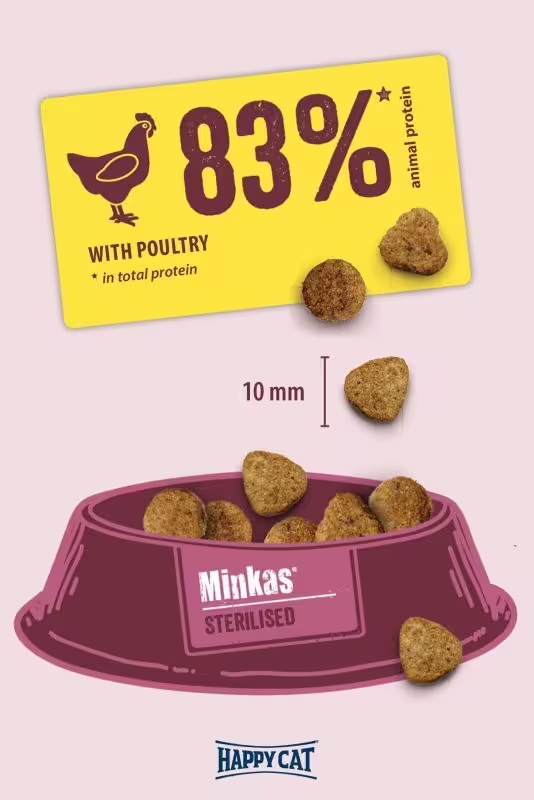 Happy Cat Minkas Sterilised Poultry is carefully formulated to meet the needs of neutered cats, supporting their metabolism while ensuring optimal health and vitality. With its rich, delicious taste and natural ingredients, this is a meal your cat will love, every day.