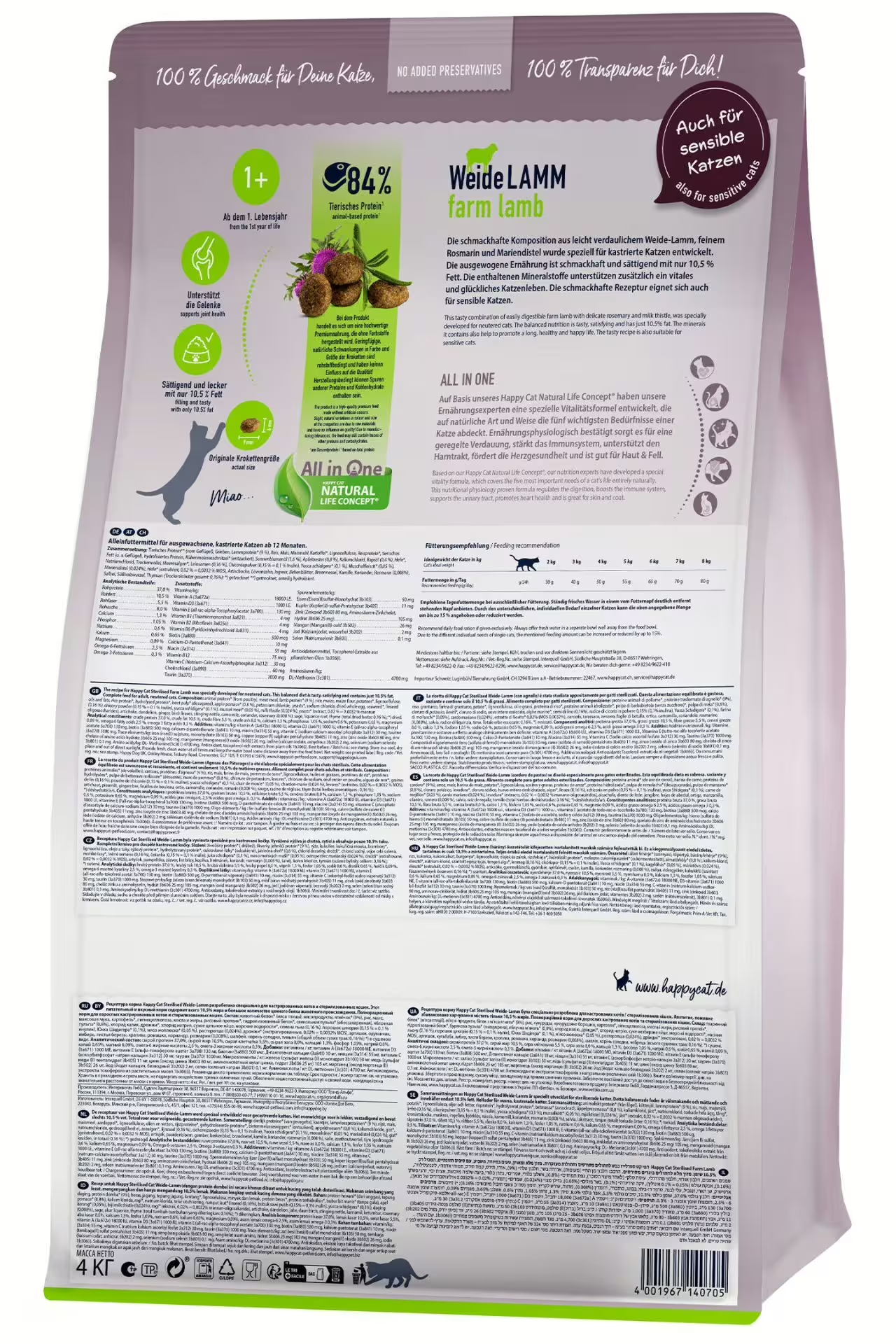 Happy Cat Sterilised Adult Pasture Lamb is a specially formulated dry food designed for neutered cats, offering a balanced combination of easily digestible lamb from natural pastures, rosemary, and milk thistle. This delicious recipe helps maintain an optimal weight while keeping your cat feeling satisfied and full with only 10.5% fat.