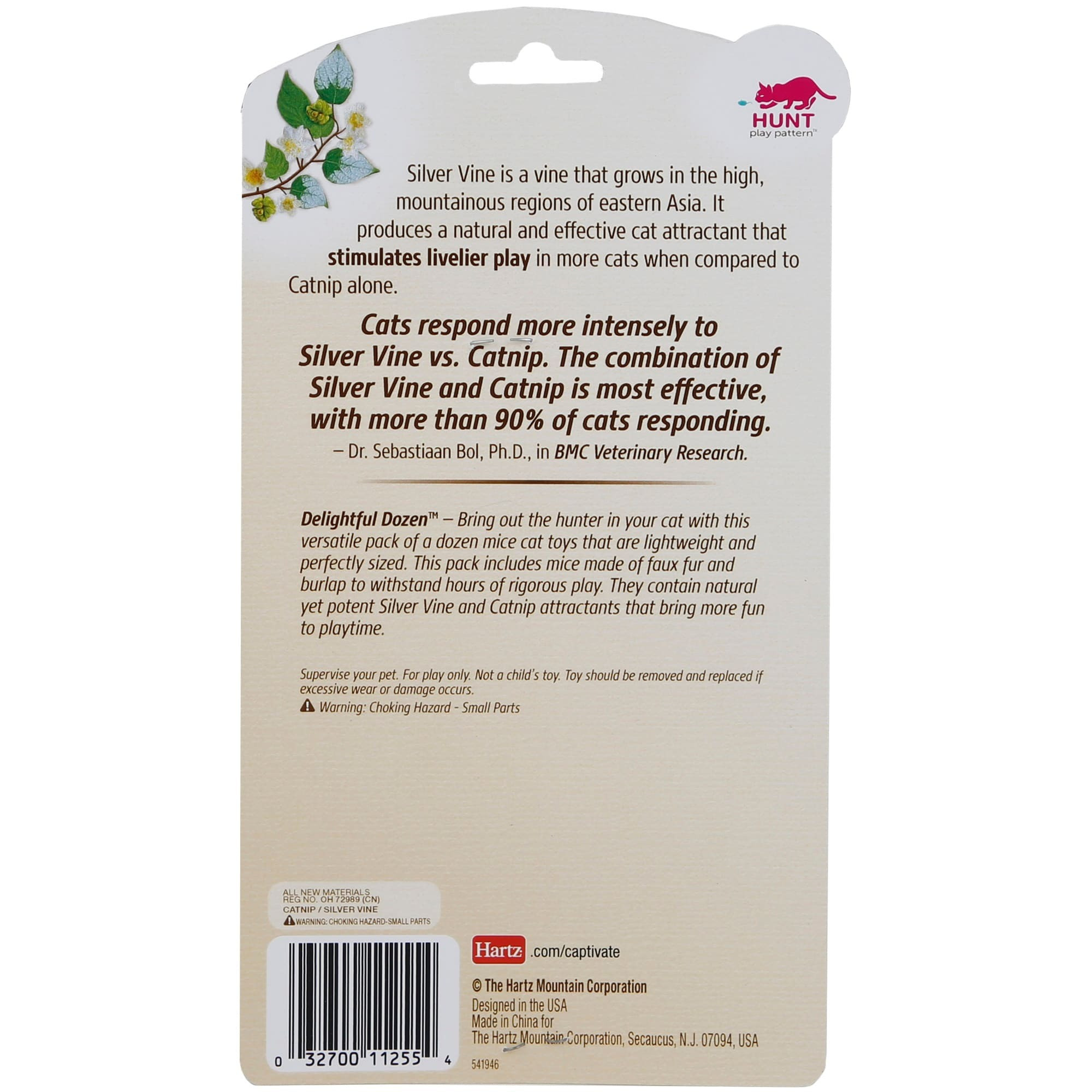 Give your cat endless hours of natural hunting fun with the Hartz Captivate “Delightful Dozen” — a versatile 12-pack of lightweight, perfectly-sized mice infused with Silver Vine & Catnip for extra-lively play.