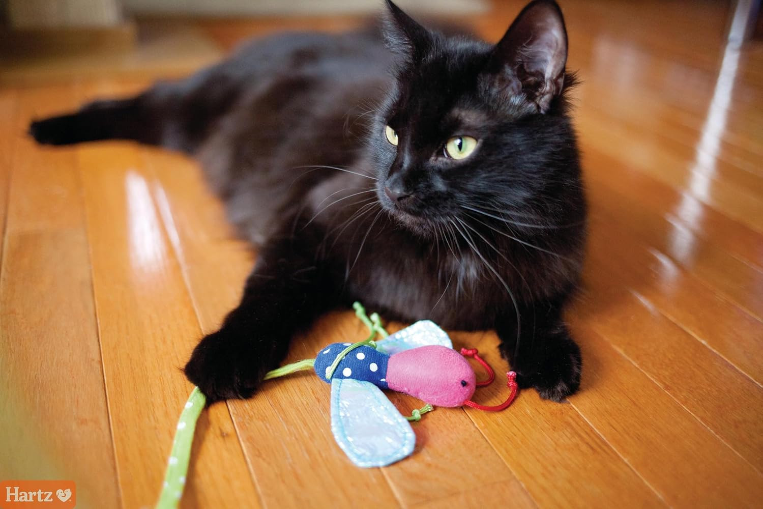 Features vibrant colours, sparkly wings, and soft plush textures that appeal to a cat’s senses.