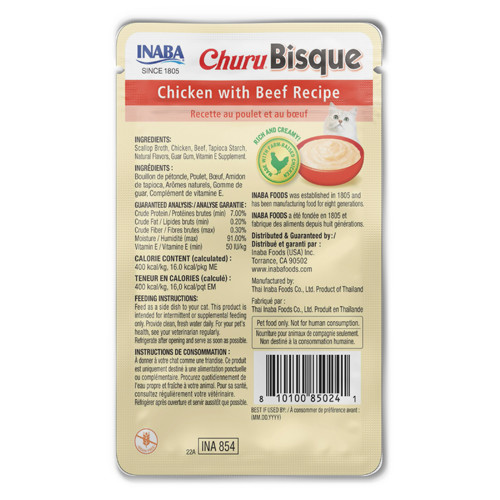 Inaba Churu Bisque Chicken with Beef Recipe is a rich, creamy, and hydrating cat food complement made with high-quality farm-raised chicken and beef. This smooth, velvety bisque is perfect as a meal topper, side dish, or tasty treat. Free from grains, preservatives, carrageenan, and artificial colors, it is enriched with Vitamin E for immune support, making it a healthy and delicious addition to your cat’s diet.