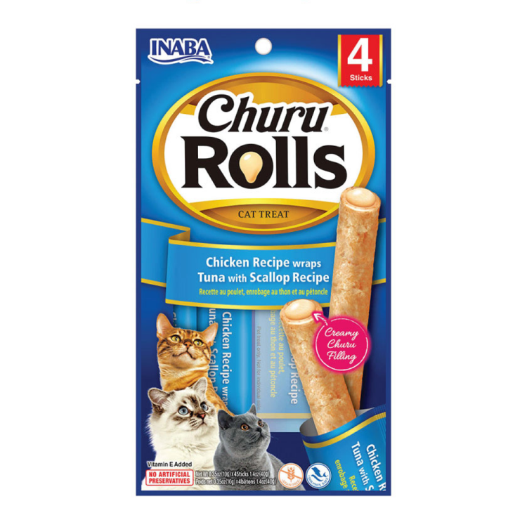 Give your cat an irresistible dual-texture treat with Inaba Churu Rolls! These soft chicken sticks are wrapped around a creamy tuna and scallop Churu filling, providing a delicious blend of flavors and essential nutrients.