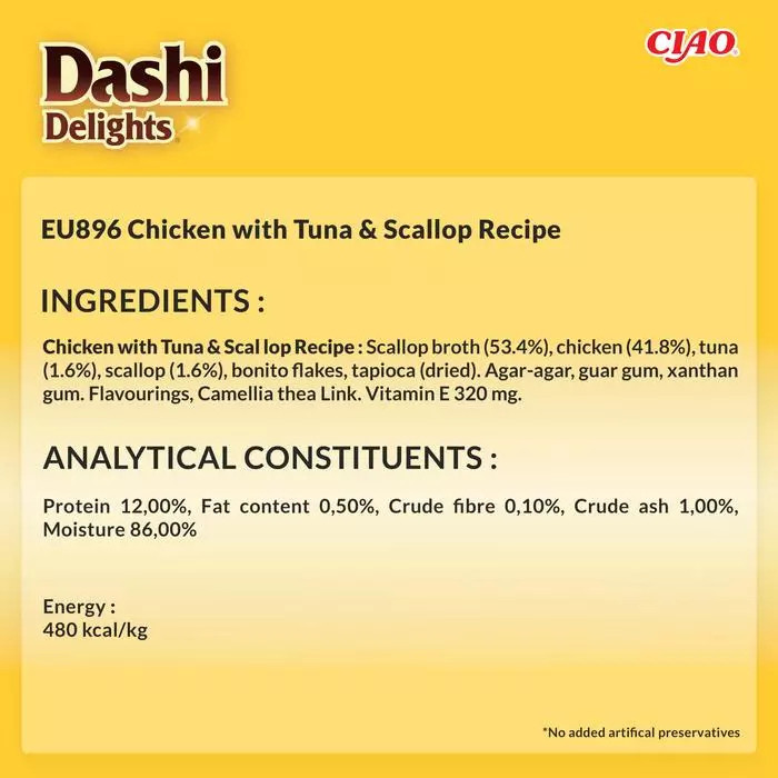 A premium blend crafted for gourmet feline taste buds. Inaba Dashi Delights Delicate Flakes combines tender chicken with tuna and scallop in a light seafood gelée, providing a flavorful and hydrating treat your cat will love.