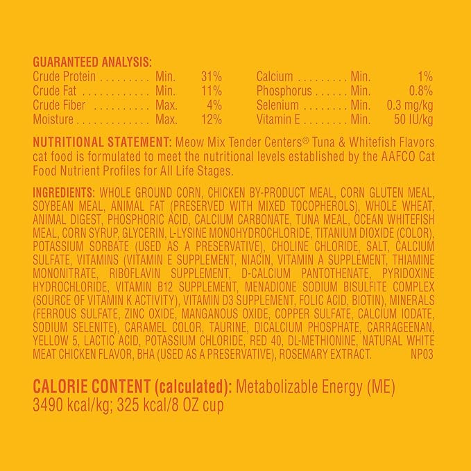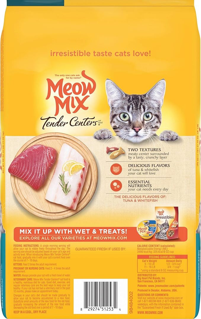 Give your cat a meal that excites their taste buds with Meow Mix Tender Centers™ Tuna & Whitefish. This irresistible dry cat food features a unique dual-textured kibble—crispy on the outside and soft and meaty on the inside. Bursting with the savory flavors of tender tuna and ocean whitefish, it delivers a deliciously satisfying experience in every bite. Fortified with essential vitamins and minerals, it helps support your cat’s overall health while making mealtime a moment of joy.