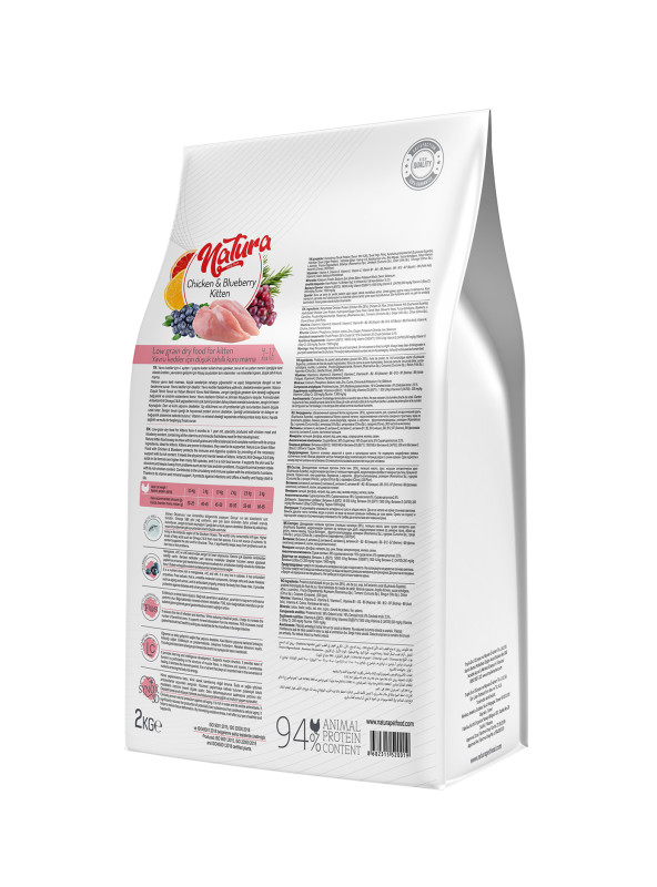 Specially formulated for kittens, Natura Low Grain Kitten Food provides essential nutrition for healthy growth and development from the 4th month to 1 year of age. With 94% of its protein content derived from premium animal sources like chicken and enriched with antioxidant-rich blueberries, this recipe supports both physical and mental development.