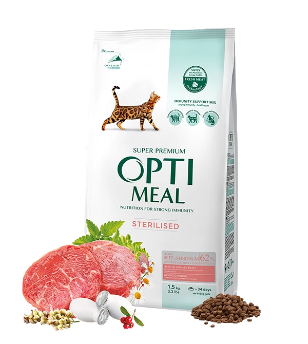Optimeal High in Beef and Sorghum Formula is a super-premium dry food tailored to meet the nutritional needs of sterilised adult cats. Developed under veterinary supervision using advanced Swiss Pet Nutrition Group technology, this recipe supports urinary health, weight control, and overall well-being with high-quality animal proteins and carefully selected ingredients.
