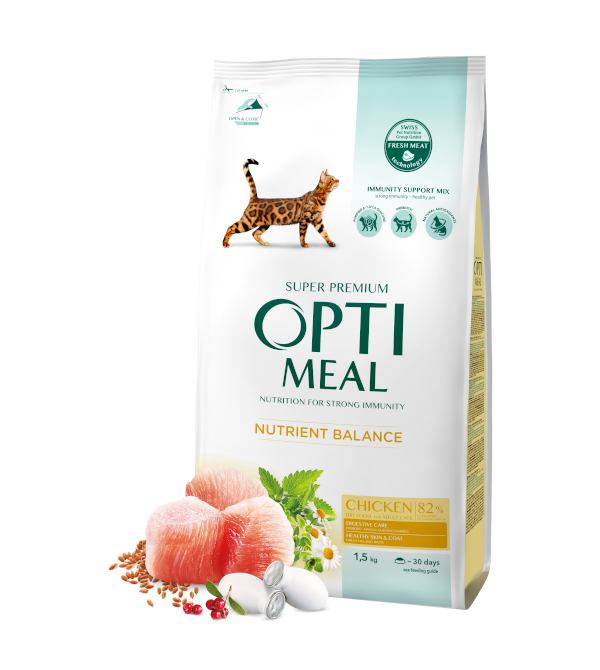 Optimeal Dry Pet Food for Adult Cats – Chicken is a Super Premium formula designed to provide balanced nutrition, healthy digestion, and immune support for adult cats. With 81.91% protein of animal origin, including fresh chicken as the primary ingredient, this diet ensures high-quality, easily digestible protein for optimal muscle maintenance and vitality. Developed under the supervision of veterinarians using Swiss Pet Nutrition Group technology, this formula offers complete care for your cat’s health.