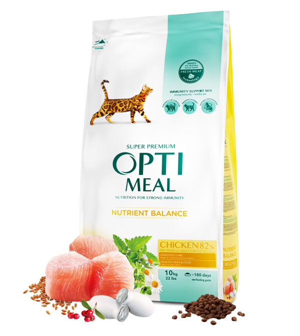 Optimeal Dry Pet Food for Adult Cats – Chicken is a Super Premium formula designed to provide balanced nutrition, healthy digestion, and immune support for adult cats. With 81.91% protein of animal origin, including fresh chicken as the primary ingredient, this diet ensures high-quality, easily digestible protein for optimal muscle maintenance and vitality. Developed under the supervision of veterinarians using Swiss Pet Nutrition Group technology, this formula offers complete care for your cat’s health.