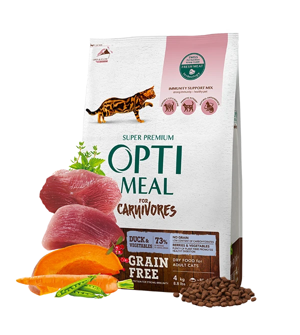 Optimeal Duck & Veggies is a super-premium grain-free dry food formulated for adult cats, offering a complete and balanced diet that supports immunity, digestive health, and optimal weight. Developed under veterinary supervision using advanced Swiss technology, this recipe is ideal for cats with food sensitivities or those requiring a gluten-free diet.