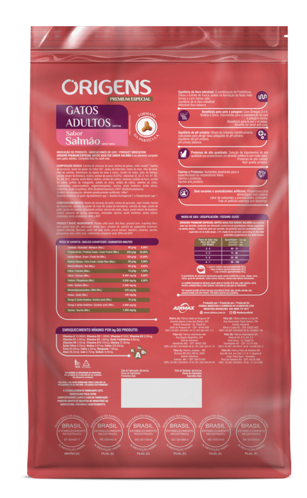 Origens is a line of Premium Special foods that nourishes the best of what there is: love. Promoting health and pleasure with each meal is an act of affection that strengthens bonds and prolongs the days of joy, friendship, and unconditional love between guardians and their pets. Origens Premium Special Adult Cats – Salmon Flavor is crafted with high-quality ingredients and free from artificial colors or flavors.
