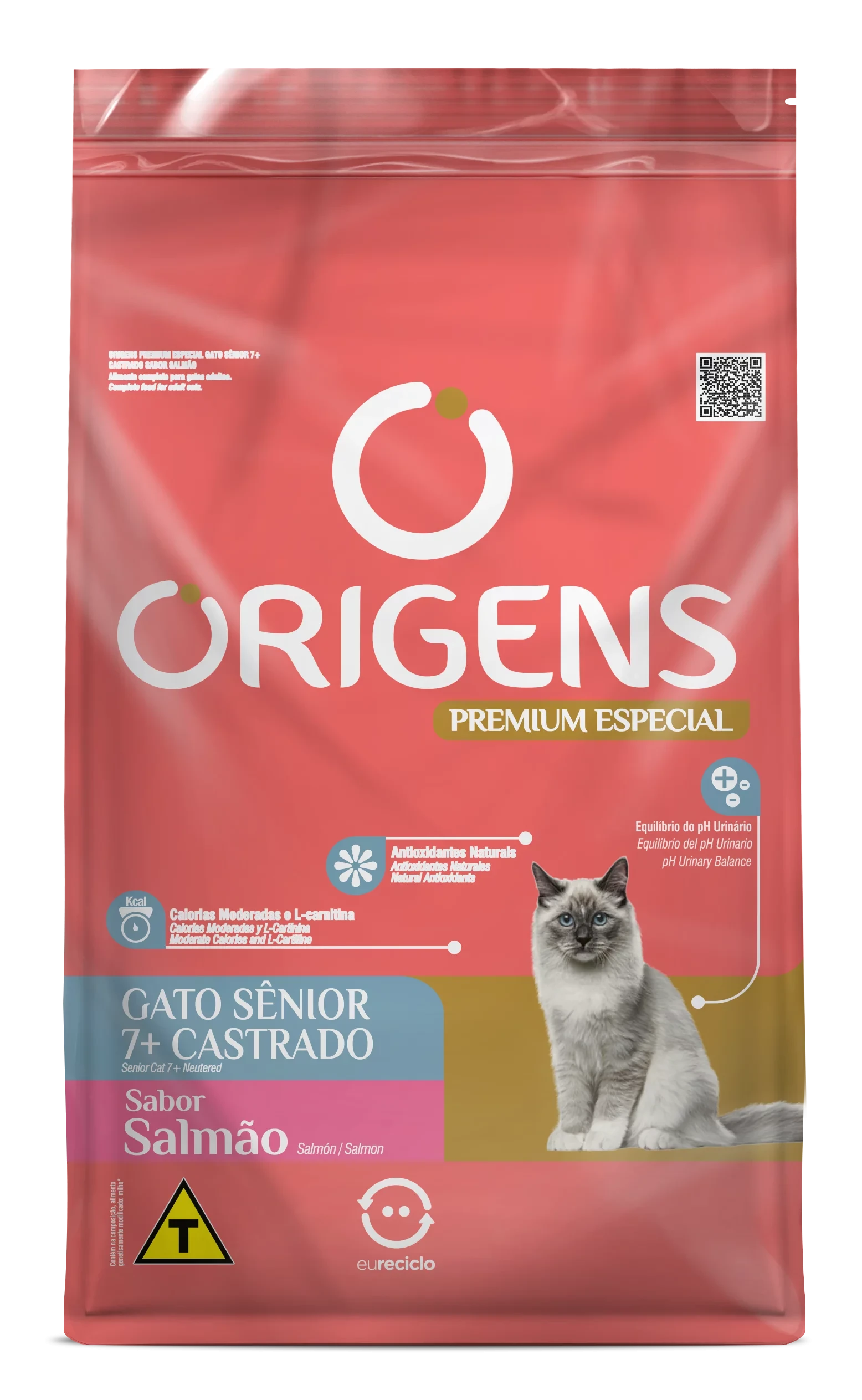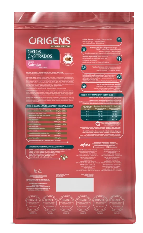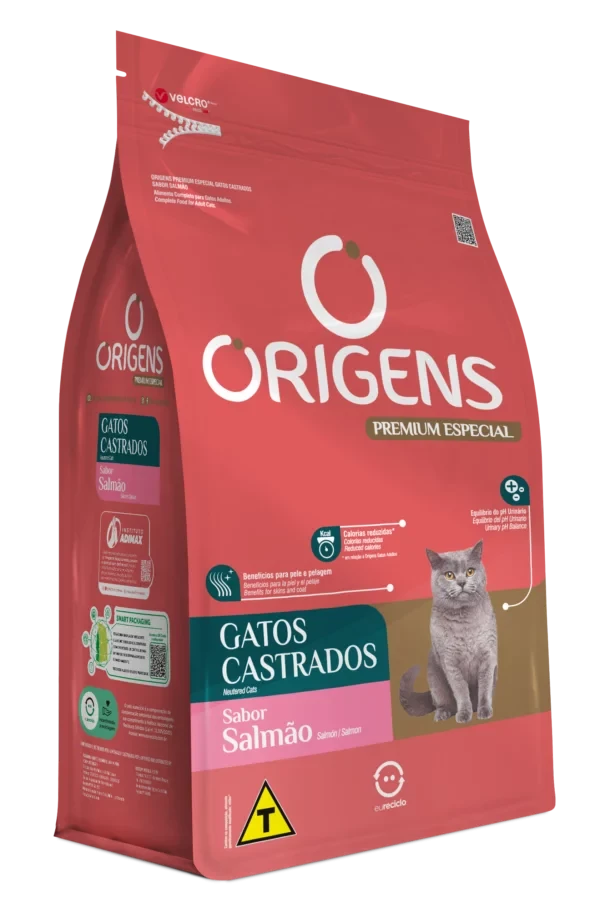 Origens is a line of Premium Special foods that nourishes the best of what there is: love. Promoting health and pleasure at every meal is an act of affection that strengthens bonds and prolongs days of joy, friendship, and unconditional love between owners and their pets. Origens Castrated Cats – Salmon Flavor has high-quality ingredients and does not contain artificial colors or flavors. It is recommended for castrated, sedentary cats, cats with a tendency to gain weight, and those who live in multi-cat households.