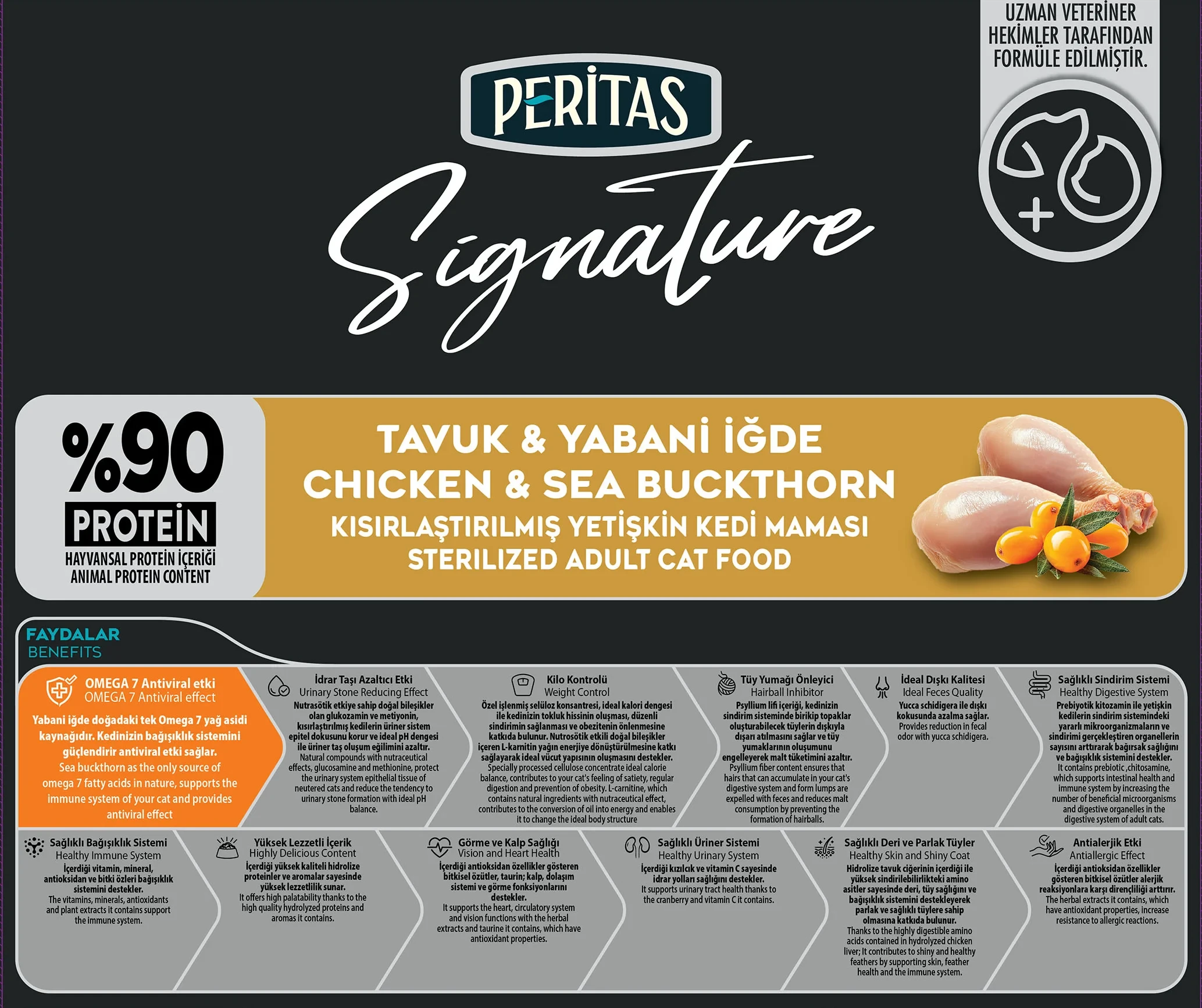 Peritas Signature Chicken Flavored Sterilized Cat Food is a complete and balanced dry food specially formulated with high-quality chicken protein and sea buckthorn to meet the daily nutritional needs of sterilized cats. Its carefully balanced formula supports urinary health, weight control, digestion, skin & coat health, and immune system function after sterilization.