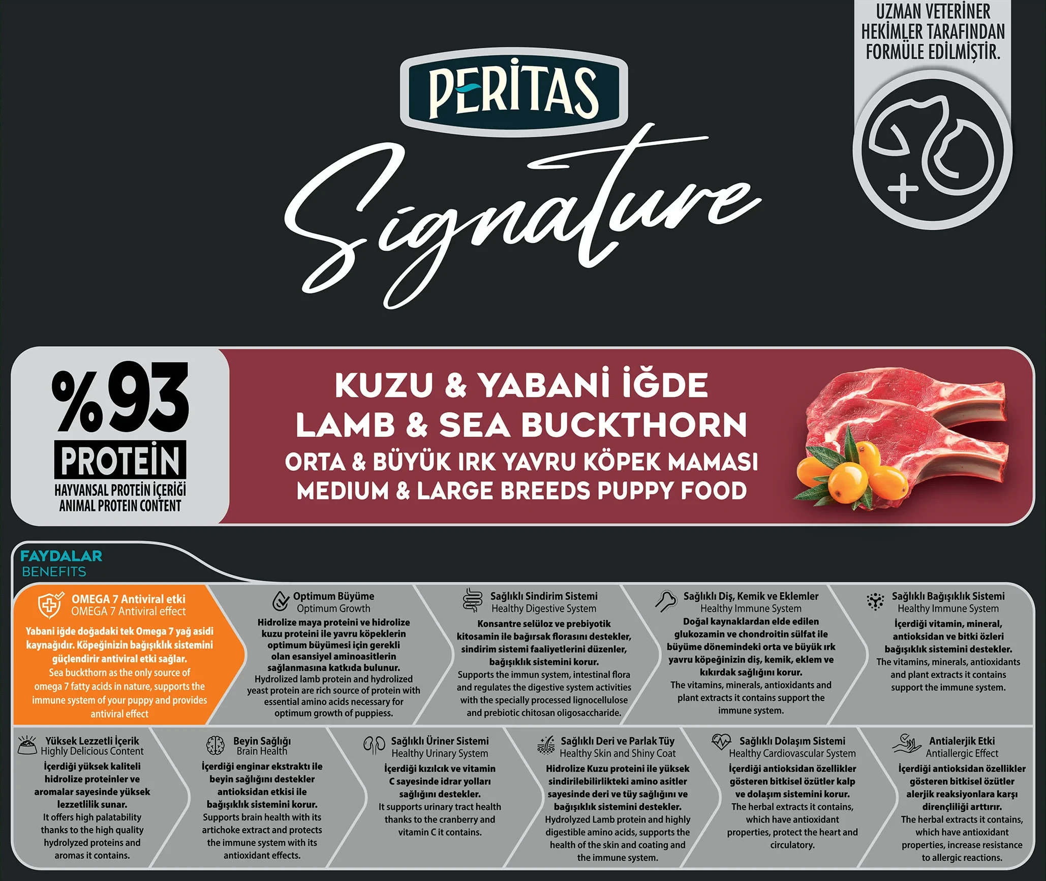 Peritas Signature Lamb Meat Puppy Food for Medium and Large Breeds is a complete and balanced dry food specially developed to meet the daily nutritional needs of growing puppies. With 93% animal protein content, this formula supports healthy growth, strong bones and joints, immune system development, and overall vitality during the crucial puppy stage.