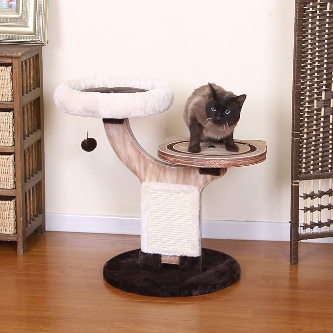 The upper plush bed provides a soft, elevated spot for napping, while the lower wooden platform doubles as a resting area or lookout point. A built-in sisal scratching panel satisfies your cat’s natural scratching instincts, protecting your furniture. The dangling pom-pom toy encourages playful swatting and keeps curious cats entertained.