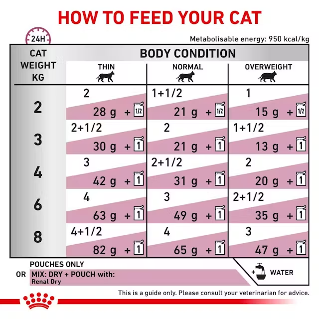| Cat Weight (kg) | Thin (g/day / pouches) | Normal (g/day / pouches) | Overweight (g/day / pouches) |