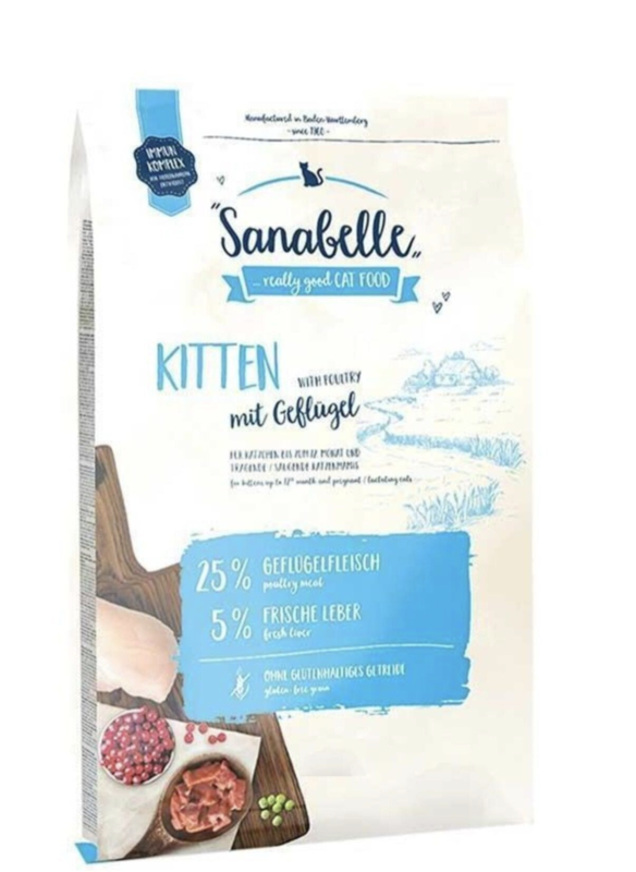 Sanabelle Kitten with Poultry is a high-quality complete food designed for kittens up to 12 months of age, as well as pregnant and nursing mother cats. With a nutrient-rich formula, it ensures optimal growth and development for kittens and supports the unique nutritional needs of mother cats during pregnancy and lactation. This recipe includes 25% fresh poultry meat and 5% fresh liver, providing high-quality protein and essential nutrients. It is gluten-free, making it ideal for sensitive cats. The addition of mannanoligosaccharides, beta-glucans, and natural ingredients helps stabilize the immune system and promotes overall health.
