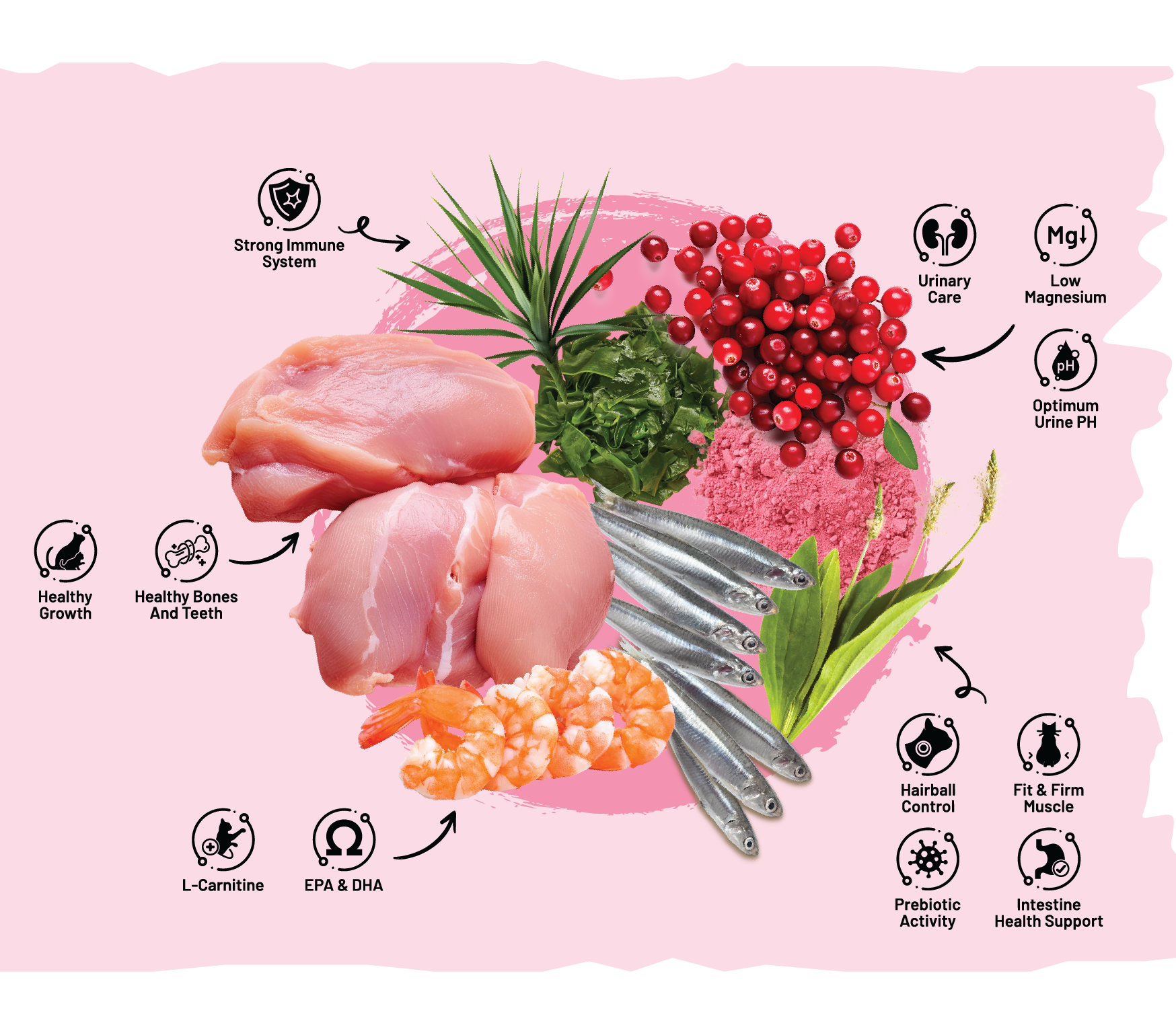 Dehydrated Chicken Protein (46%), Baldo Rice (14%), Maize, Refined Chicken Oil, Anchovy Meal (7%), Krill Meal, Brewer’s Dried Yeast, Hydrolyzed Chicken Liver, Anchovy Oil, Nucleotide Yeast Protein, Minerals, Prebiotic Mannan Oligosaccharides, Seaweed, Yucca Extract, Cranberry Powder, Psyllium