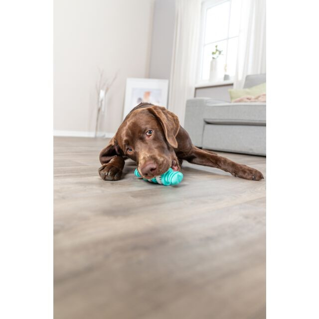 The Trixie Denta Fun Bone is a durable chewing toy designed to support dental care during play. Made from natural rubber and flavored with mint, it helps massage the gums while encouraging active chewing.