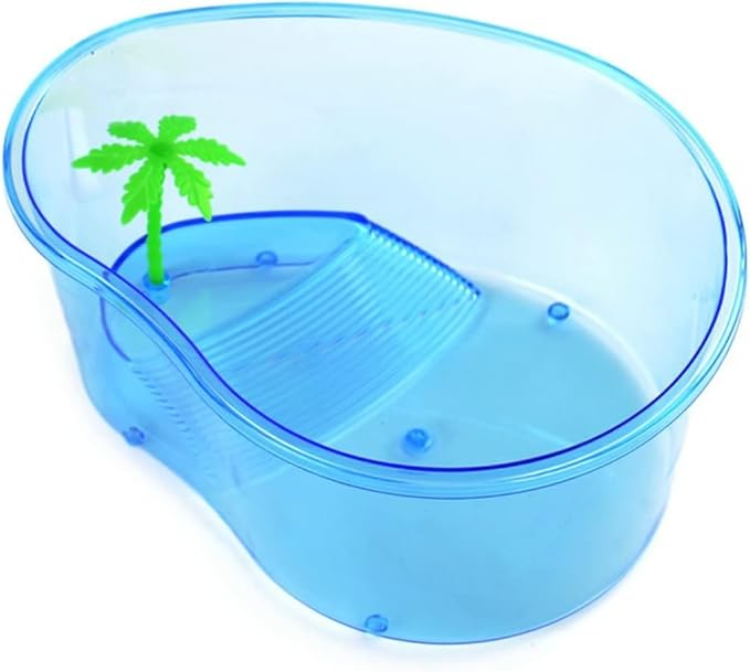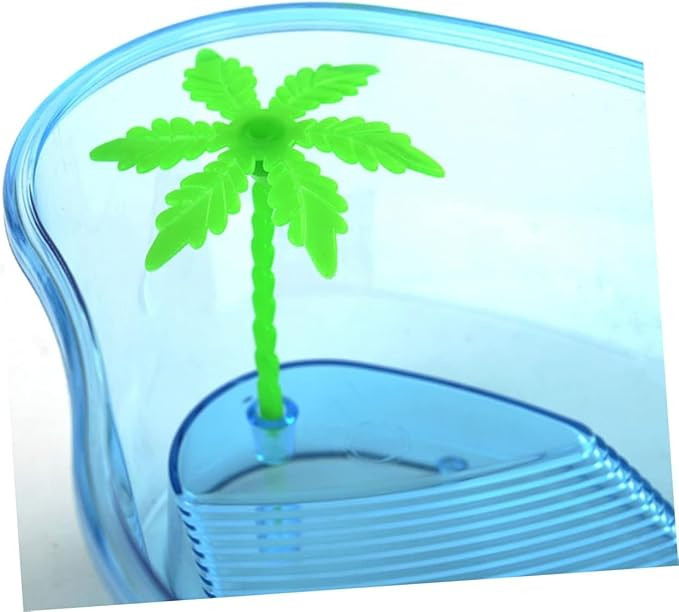This uniquely designed turtle tank provides a comfortable and stimulating environment for your aquatic pets. Featuring a compact design with a built-in ramp and a charming green palm tree decoration, it creates a natural and engaging habitat for turtles, small amphibians, or other aquatic creatures. Its transparent material allows clear visibility of your pet's activities, making it an excellent addition to any home.