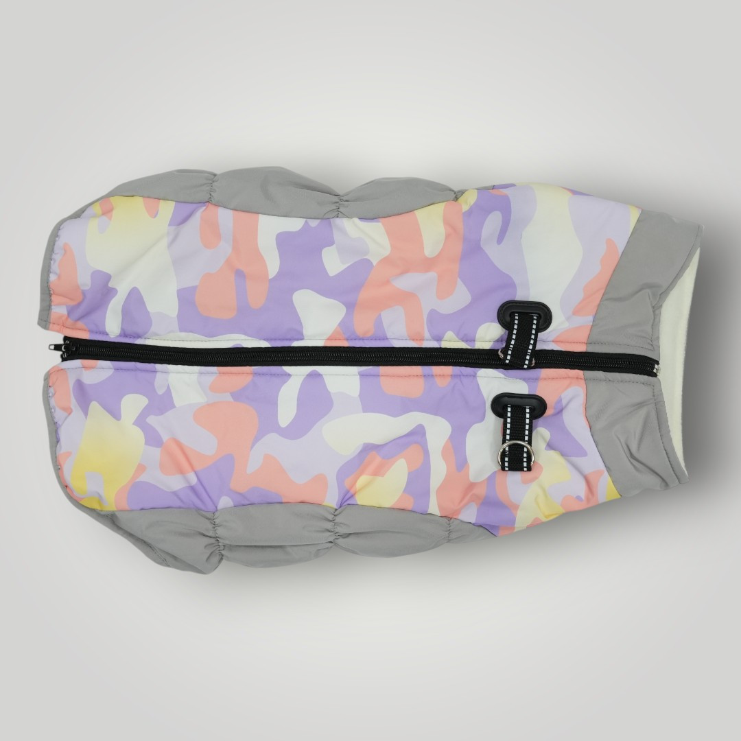 This pastel camouflage jacket combines fashion and practicality in one cute design. The soft hues of lavender, peach, and yellow create a playful, modern look while the lightweight padding keeps your pet warm on cooler days without adding bulk.